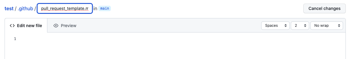 先ほど作った「.github」ディレクトリ内に「pull_request_template.md」と記載し、「Edit new file」にはテンプレート内容を記載します。